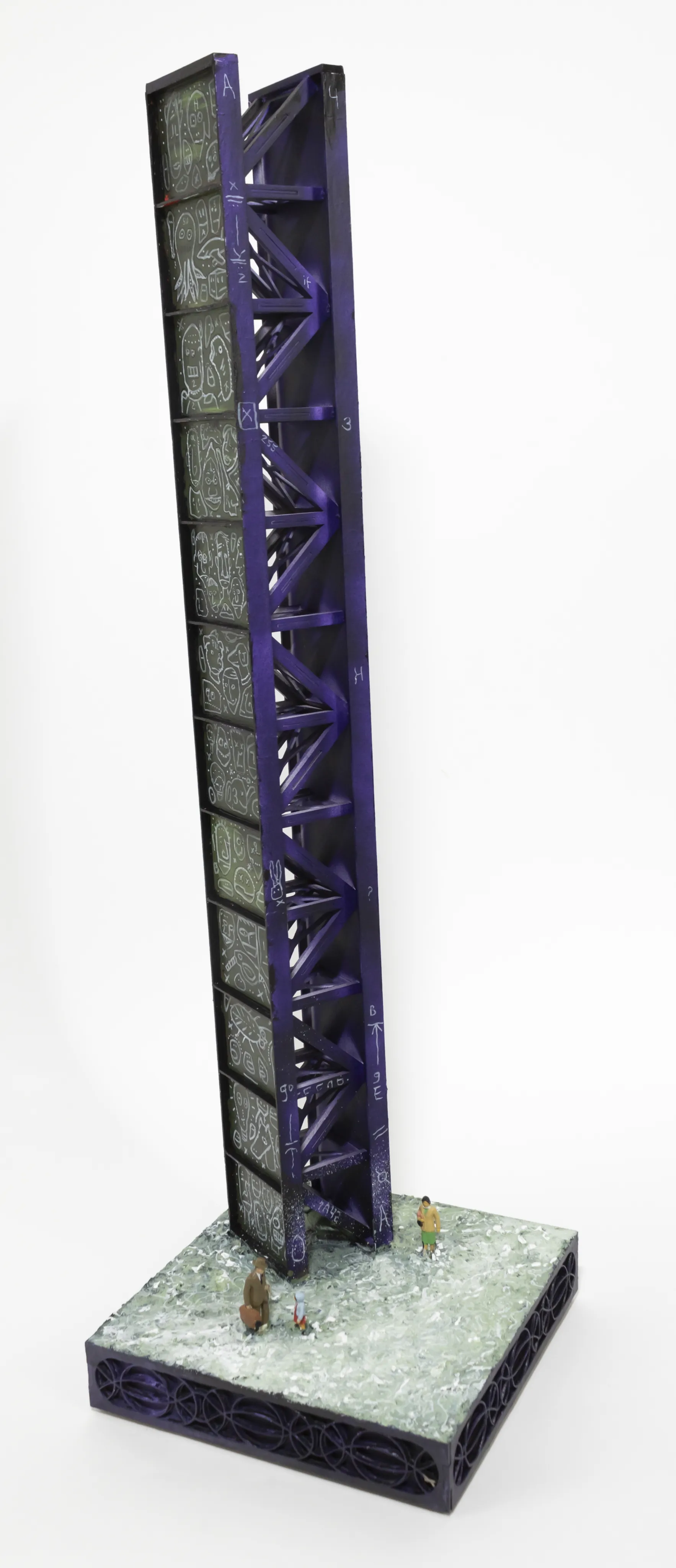 wood, chipboard, O-scale figures, acrylic, ink